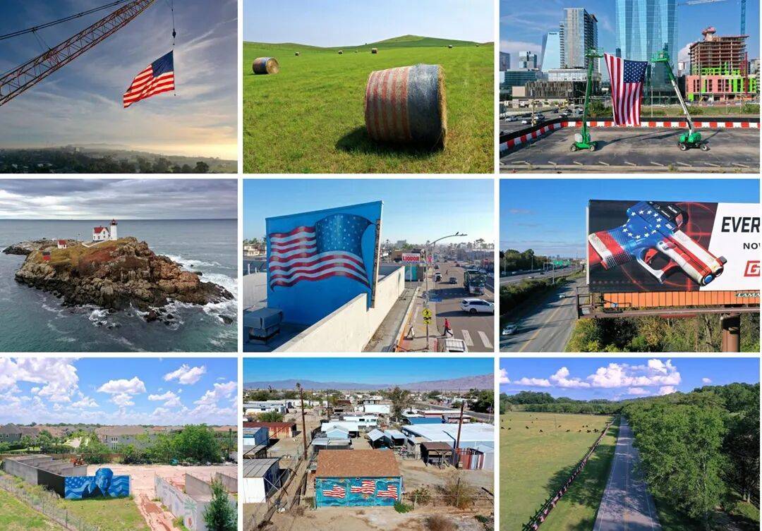 对国家象征的考察揭示出,在美国境内国旗展示具有显著的普遍性。这种现象似乎在社会分裂与纷争时期呈现加剧趋势。国旗被用来表达多种情感,包括民族自豪感、异议、团结呼吁,以及作为政治反对的象征。从设计角度看,美国国旗由星条与色彩构成的复杂图案形成视觉焦点,尤其在航拍视角下更显震撼。因此在美国语境中,国旗的影像呈现往往引发多元解读,特别是那些历史上认同国旗却如今对其象征意义产生复杂认知的人群。