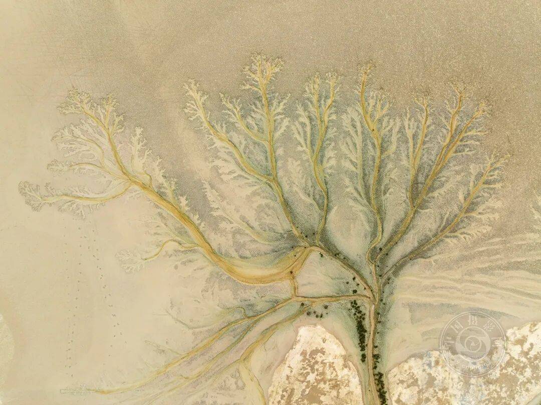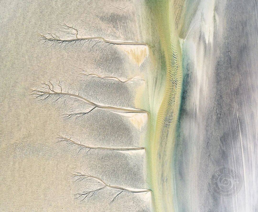 潮水退去时,溪流干涸,留下树枝状的纹路:沙中刻画的树形蚀刻,揭示了水、运动与生命之间错综复杂、持久不变的联系。
