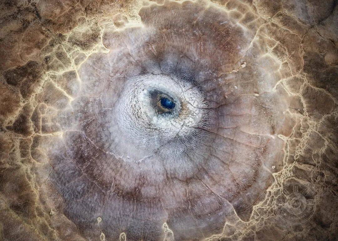 冰岛赫维拉维利尔的鸟瞰图呈现出一个形似动物眼球的地热池,池心呈深蓝色,周围环绕着深褐色的纹理。荒芜的岩石地貌与层叠的矿物沉积赋予这片景象原始而古老的气息。