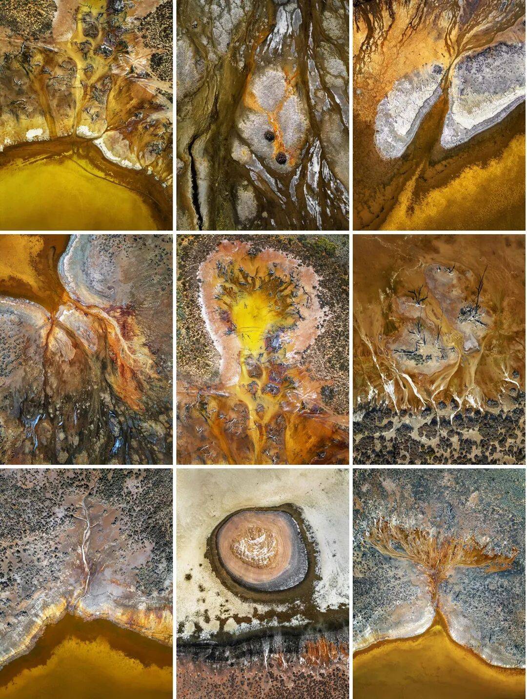 尼尔米妮的航拍作品灵感源自澳大利亚原住民的土地生活方式及其艺术创作。作为一名水利工程师,她也在地貌中探寻水源。在澳大利亚内陆地区,水是生命的源泉,因此水潭被奉为神圣之地。这些水源与栖息于此的动物共享,常是澳大利亚原住民举行“科罗博里”仪式的场所——仪式包含舞蹈、音乐、服饰及身体装饰。人们会从四面八方远道而来,共赴这些盛会。