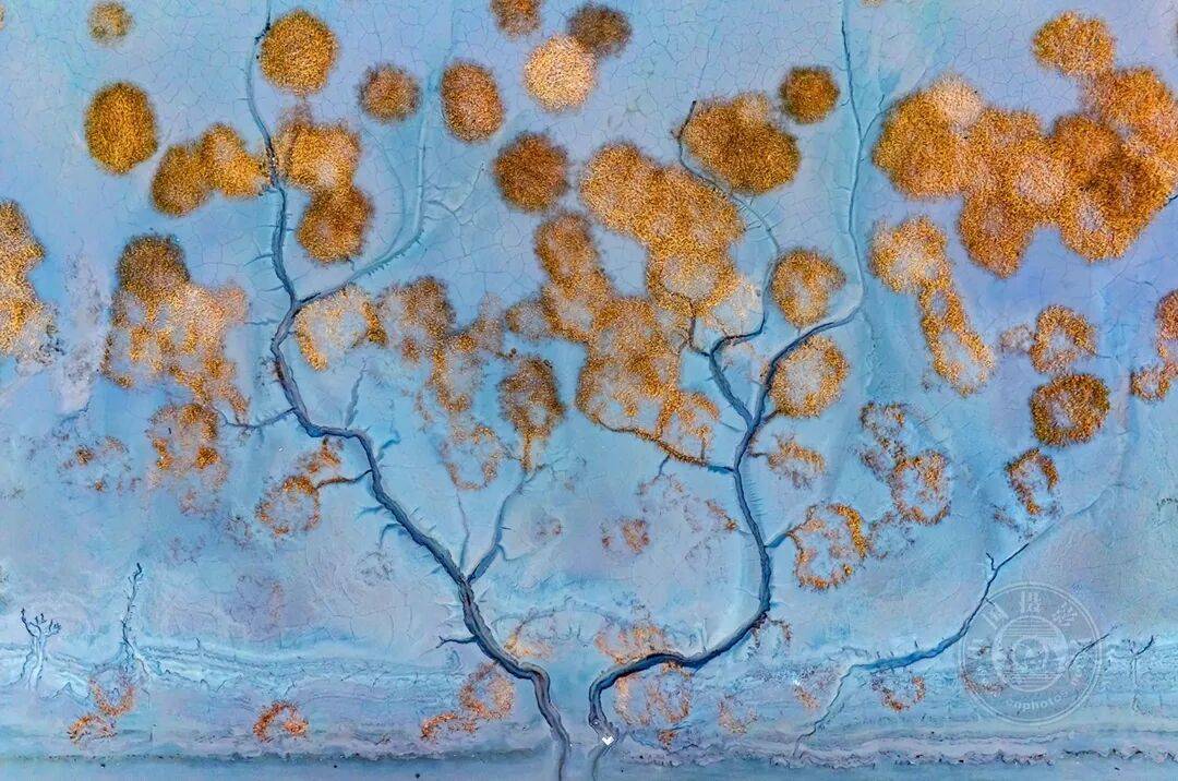 钱塘江潮是著名的自然景观与奇观。退潮时,潮水在水道中留下诸多痕迹。这些潮汐纹路与岸边干枯发黄的植物相映成趣,宛如一棵巨大的摇钱树。