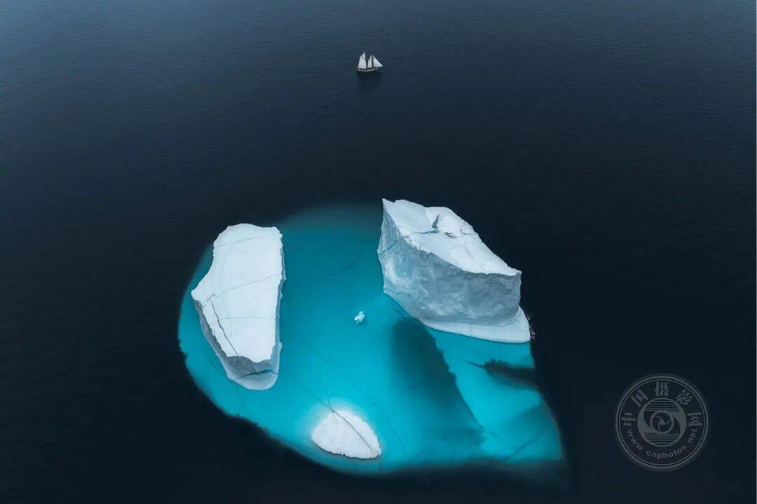 俯瞰两座巨型冰山漂浮在格陵兰岛深邃峡湾的深蓝北极海域,其浸没部分在水面下泛着碧绿光芒。远处一艘小帆船为这幅震撼的极地海景增添了尺度感与宁静氛围。