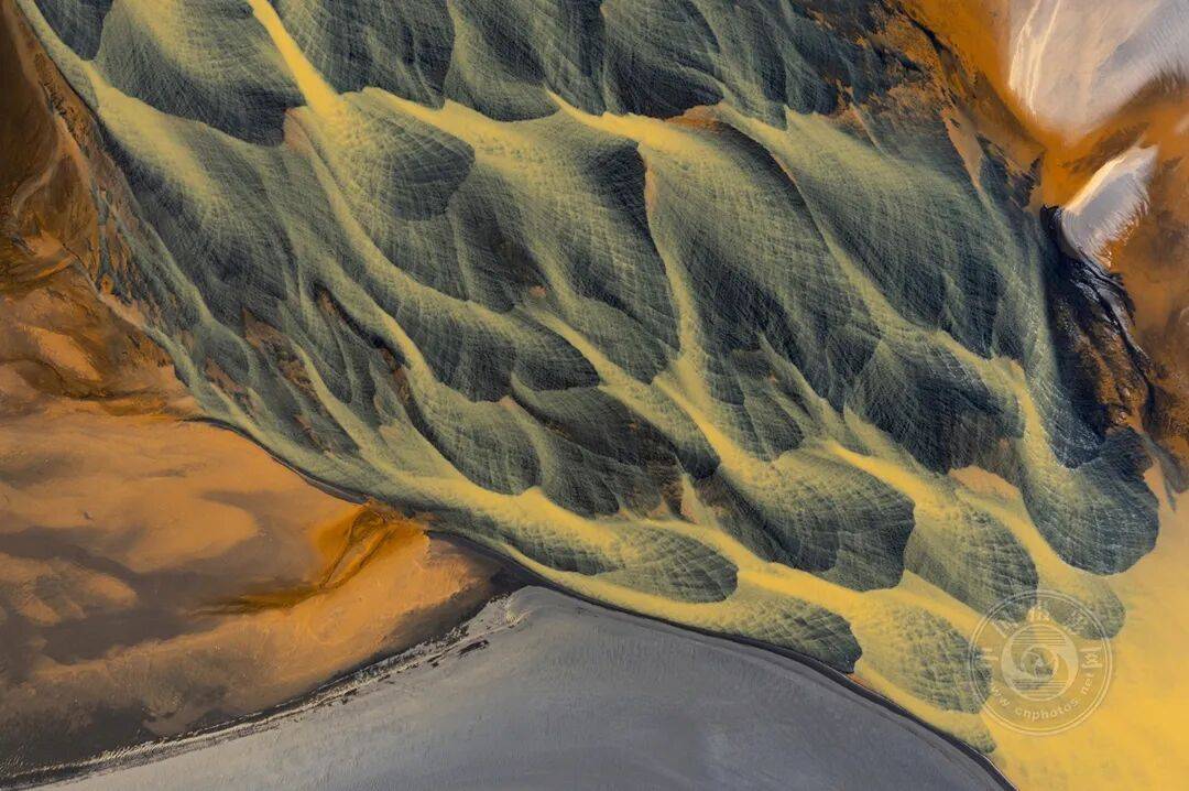 一条冰川河流携带着泥沙与沉积物,几乎抵达冰岛南部的黑色熔岩海滩,沿途形成绚丽的纹理与色彩。这些图案随季节更迭而变幻。