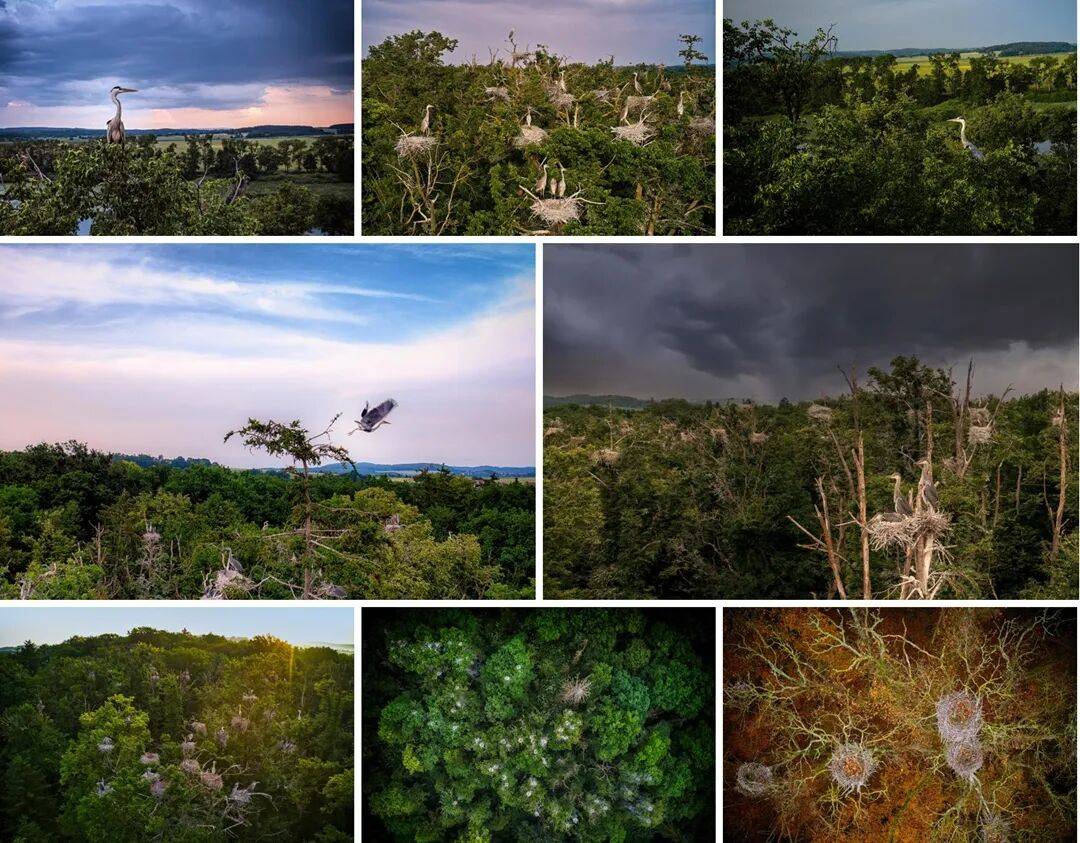 从高空俯瞰,这组照片记录了南波西米亚湿地古橡树林中灰鹭的栖息地。数十个编织巢穴如漂浮小岛般点缀在茂密绿叶间,鹭鸟们在此互致求偶之礼、筑巢育雏、守护幼雏。流转的光影与聚散的云朵,在光滑羽翼与虬结树皮间勾勒出鲜明对比,而画面下方不时掠过的水面倒影更为每个镜头增添韵律。群居的巢区与孤立的哨兵交相辉映,唤起人们对自然轮回与转瞬即逝之美的深切感悟。