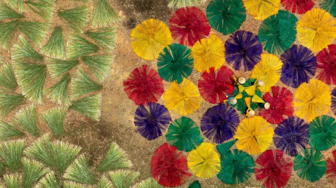俯瞰之下,日常仪式化作抽象的马赛克。铺展晾晒的彩色扫帚头将地面化作鲜活的画布。看似纯粹的几何图案,实则是传统、韵律与匠心的交织,透过无人机镜头得以呈现。