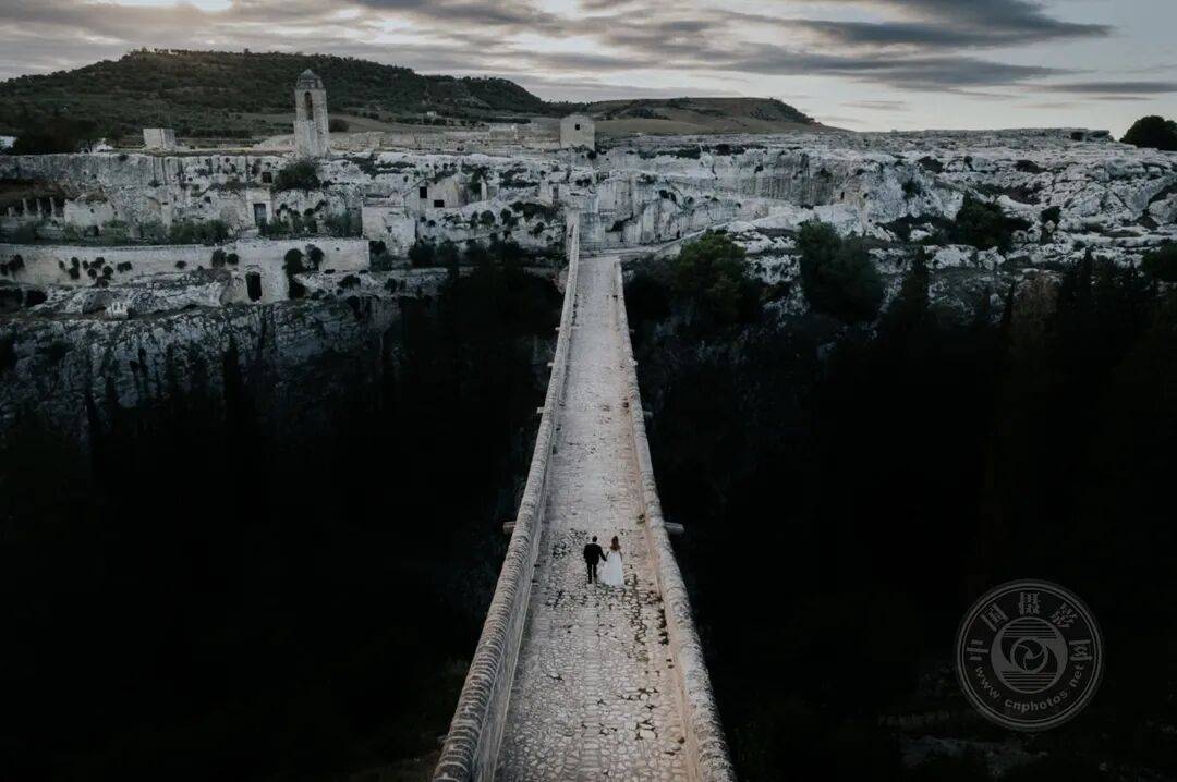 这张照片摄于一场私奔主题的婚纱拍摄。我们发现了一个绝佳的取景地:一座横跨意大利古镇深邃峡谷的桥梁。阴郁的天空与背景中如画的废墟交相辉映,共同构筑出这幅电影般的画面。