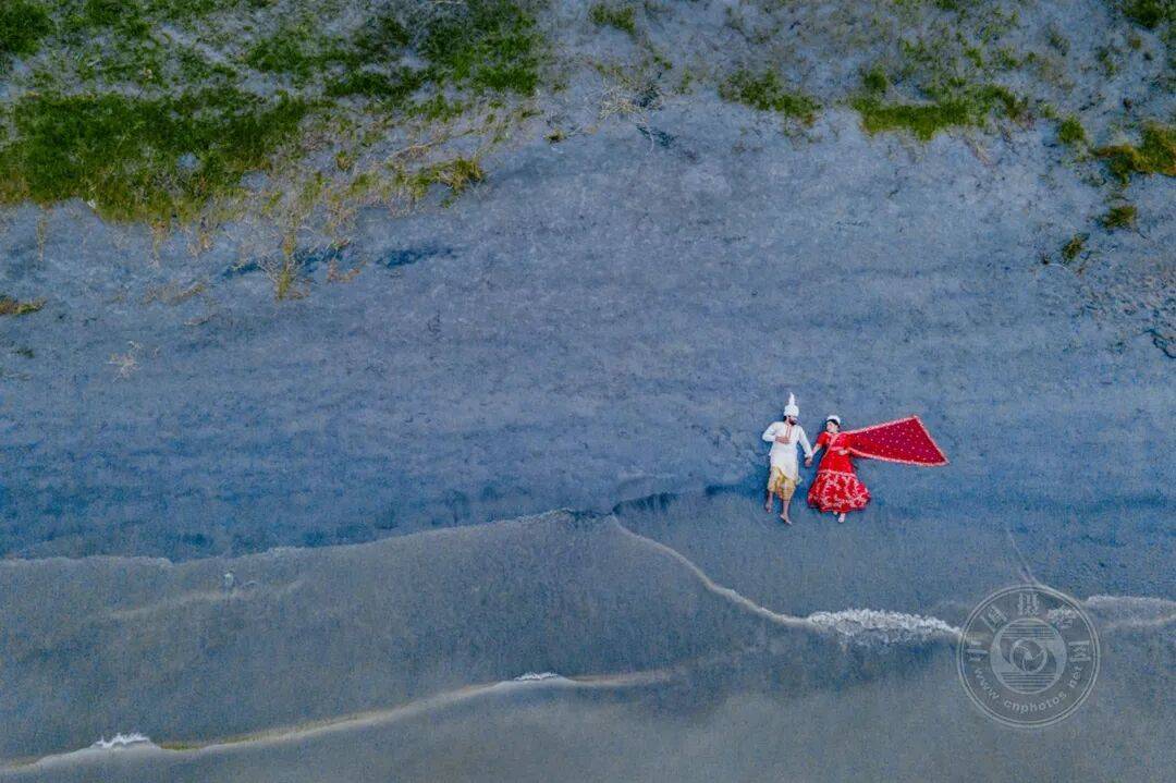 这张婚礼照片完美地捕捉了自然与爱情的交融。看似海滨的场景实为河岸,正是这对新人旅程的起点。他们被大自然宁静的怀抱所环绕,共同开启了相伴一生的旅程。